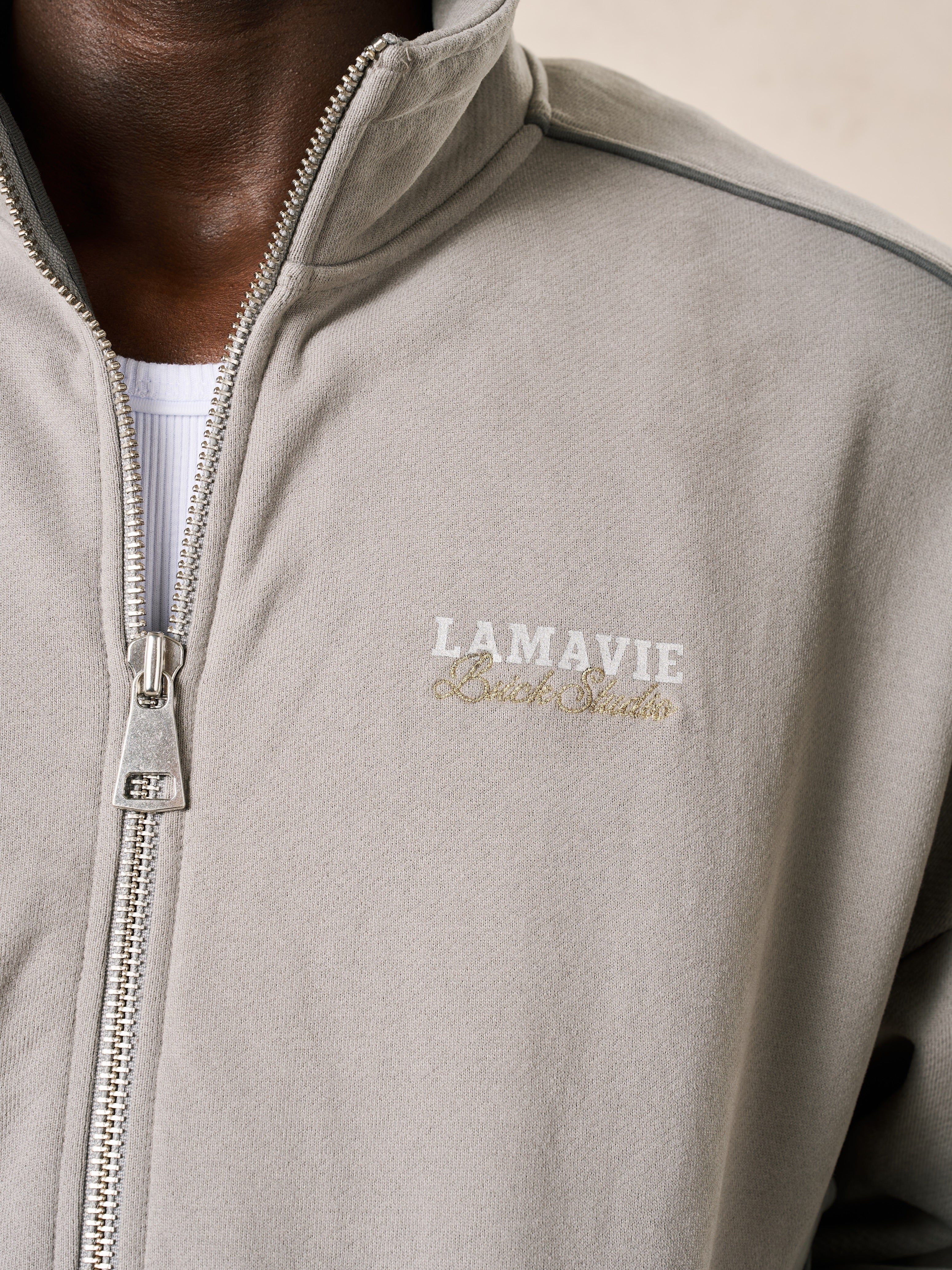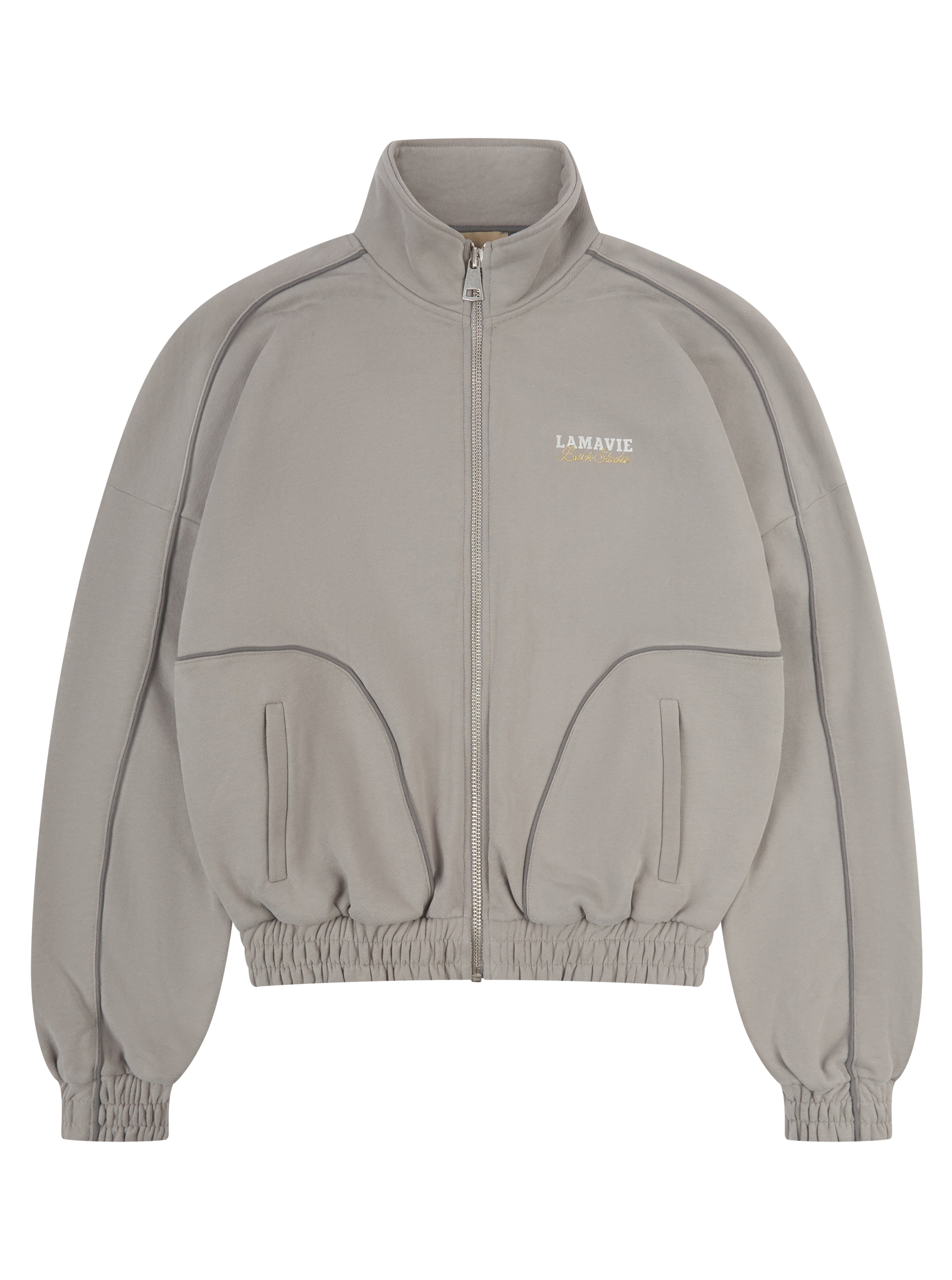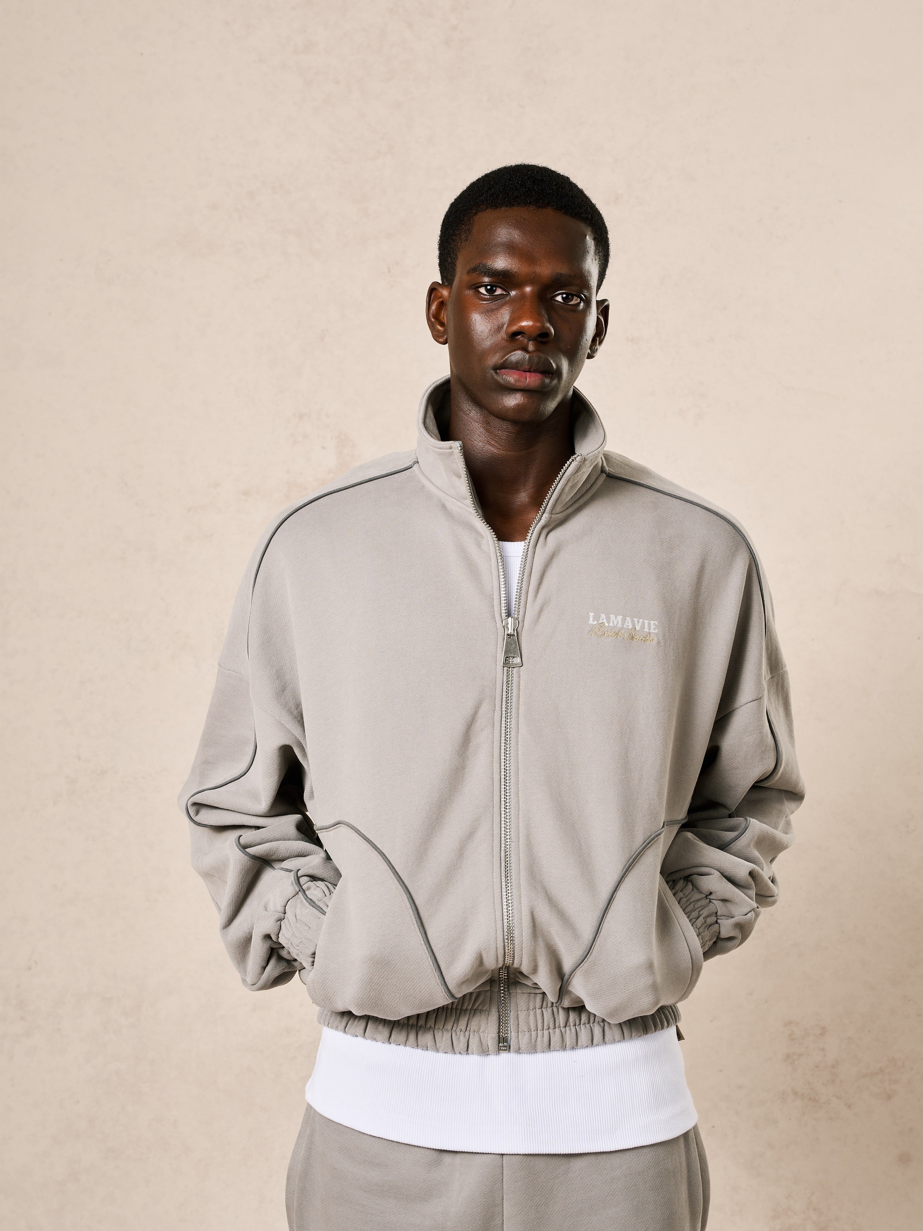 Crafted from 100% French Terry cotton with a heavyweight 500 GSM, this jacket is brushed and garment-washed to achieve a smooth, structured finish. Refined piping along the arms and upper back enhances the silhouette, complemented by Lamavie’s signature logo print and precise embroidery detailing.