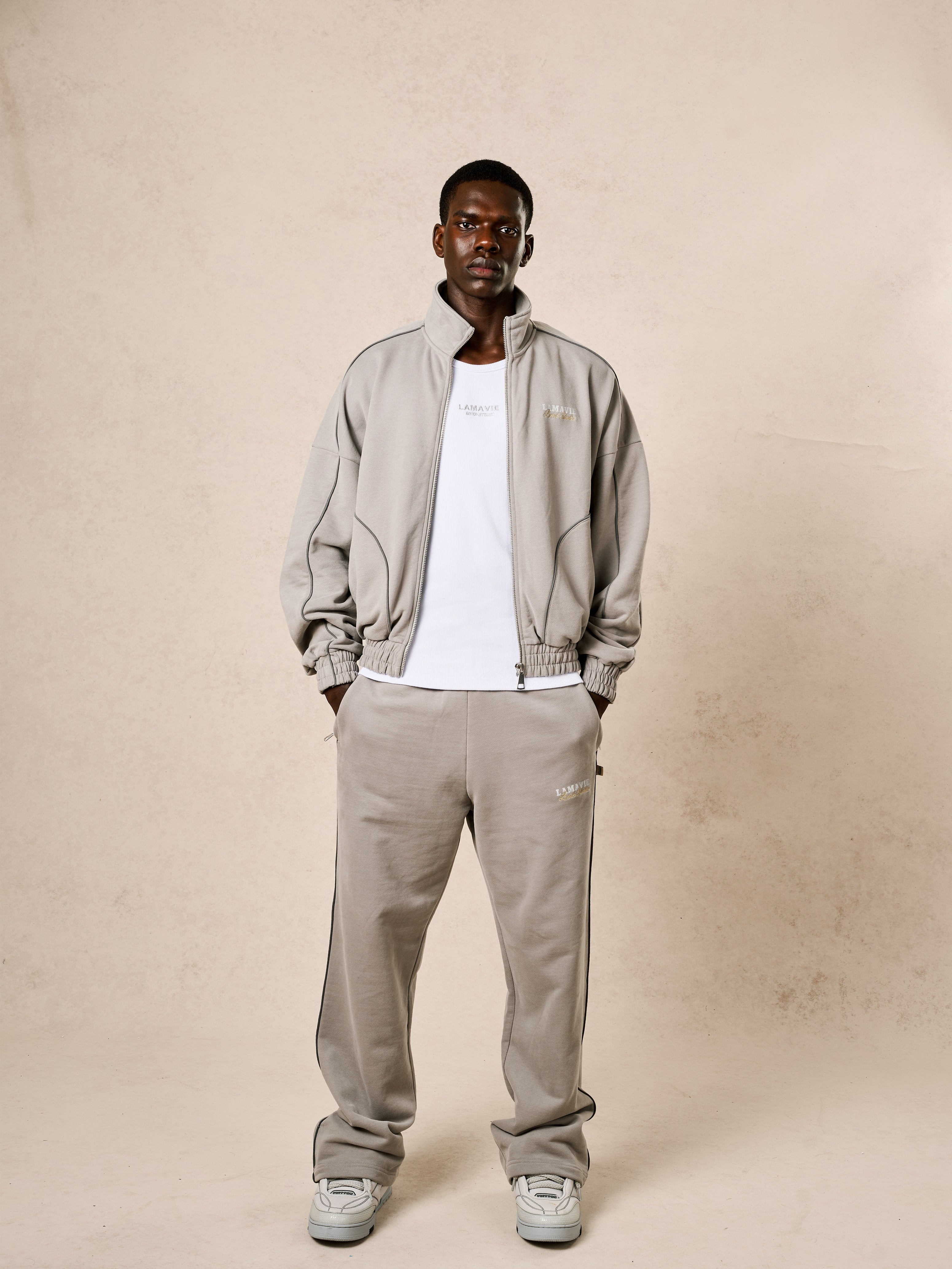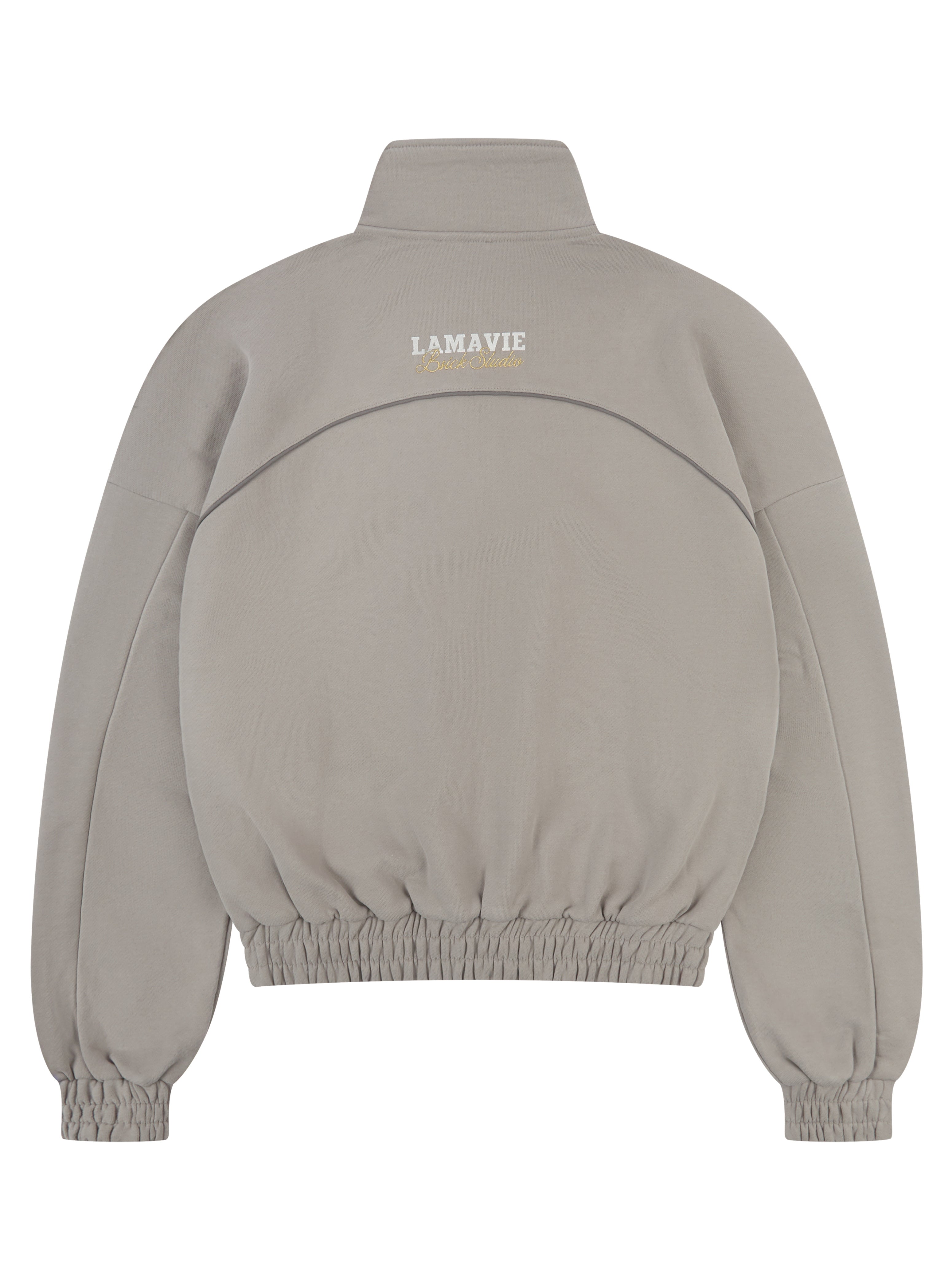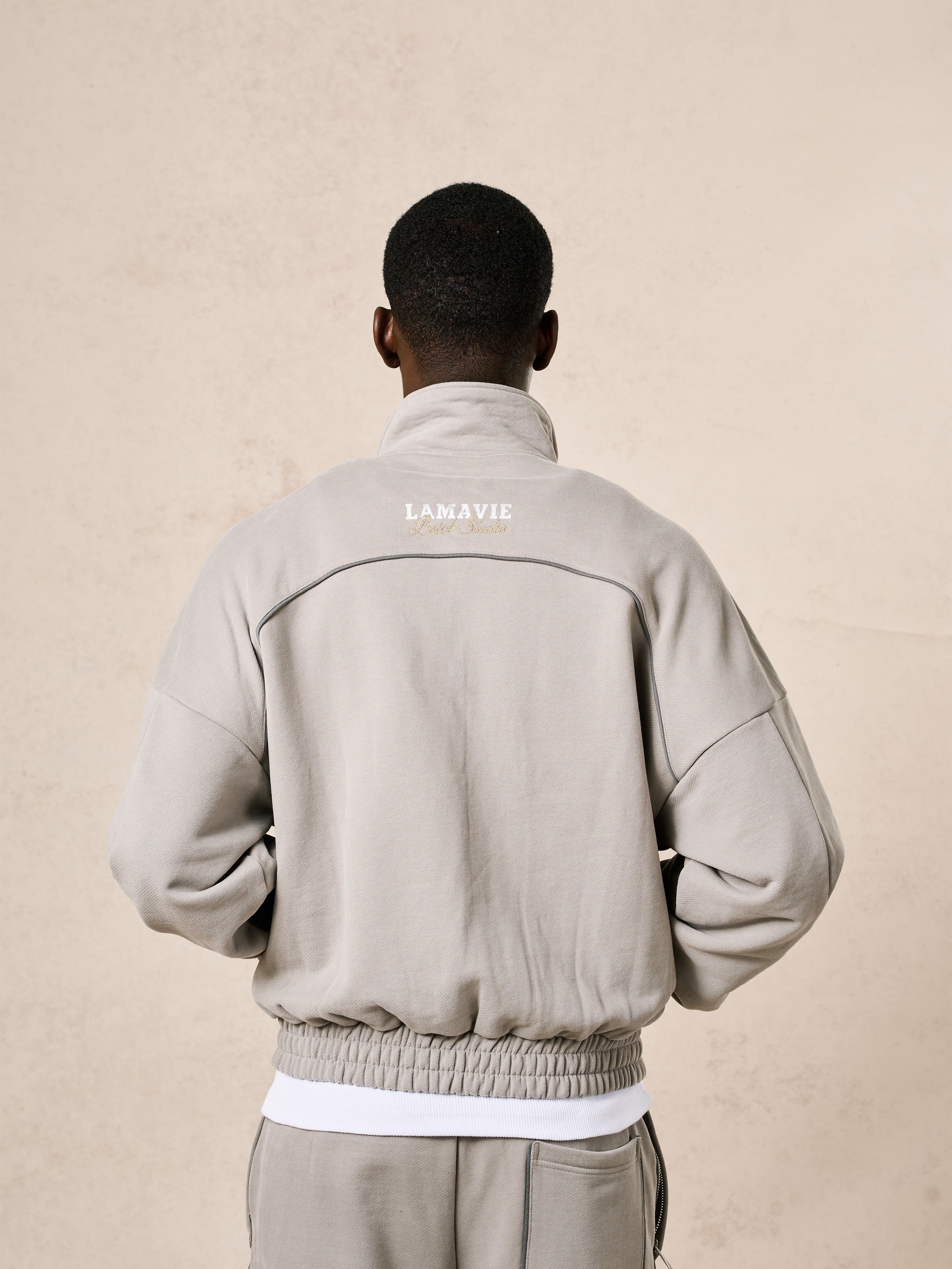 Crafted from 100% French Terry cotton with a heavyweight 500 GSM, this jacket is brushed and garment-washed to achieve a smooth, structured finish. Refined piping along the arms and upper back enhances the silhouette, complemented by Lamavie’s signature logo print and precise embroidery detailing.